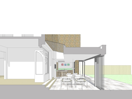 The single storey 3m deep extension located to the north of the existing rear annex, occupies the footprint of a dark and underused terrace. This matches the depth of the annex and allows for a new kitchen to be located with direct access to and benefit from views to the garden. It will be constructed from stock bricks to match the existing and will help to provide a unified appearance.